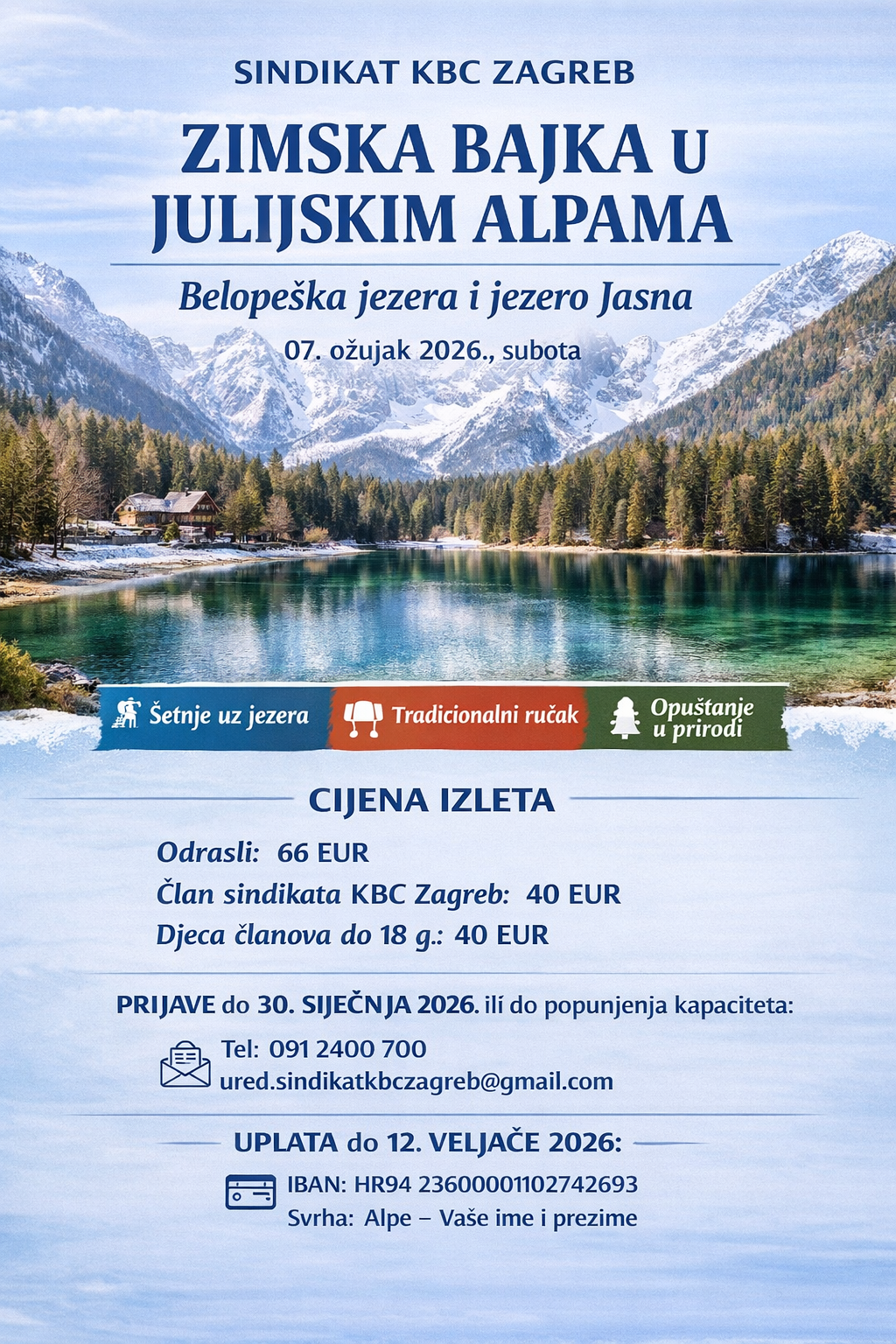 Polazak planiran u jutarnjim satima 07:00 h s unaprijed dogovorene lokacije koja najviše odgovara grupi. Udobnim turističkim autobusom krećemo prema Italiji i jednom od najljepših prirodnih područja Julijskih Alpa. Ugodna vožnja kroz Hrvatsku i Sloveniju, uz kraća zaustavljanja putem radi odmora prema potrebi grupe. Prvo odredište su Belopeška jezera (Laghi di Fusine) – slikoviti planinski biser smješten u podnožju Mangarta, uz samu granicu sa Slovenijom. Po dolasku slijedi šetnja uređenim stazama oko jezera, te slobodno vrijeme za fotografiranje, uživanje u prekrasnom krajoliku i opuštanje u tišini planinske prirode. Ovaj dio programa osmišljen je kao lagan i miran boravak u prirodi, bez žurbe i stresa.